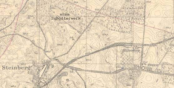 Am 1. August 1895 wurde offiziell die Eisenbahnlinie eröffnet. An der Stelle des Bahnhofes Steinberg, in der Nähe des zum Gut Steinberg gehörenden Vorwerkes Kreuz, erreicht die Bahn den Rand des Sandes und die Endmoräne.