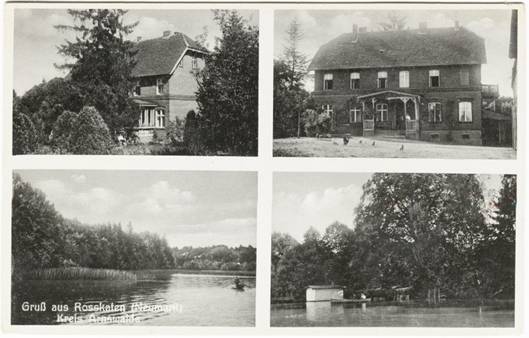 Herrenhaus (oben links), Herrenhaus, See, Bootssteg; Ansichtskarte ca. 1920 (NG)