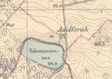 Ca. 3 km südsüdöstlich von Schwachenwalde/Chłopowo, am Nordostende vom Schwanen- See, der schon jenseits der Kreisgrenze liegt