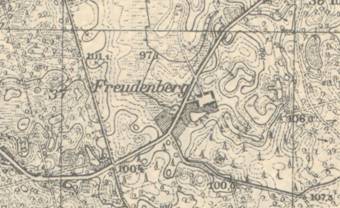 Ca. 3 km südöstlich von Sophienhof/Przybysław, im südwestlichsten Zipfel des Kreises Arnswalde